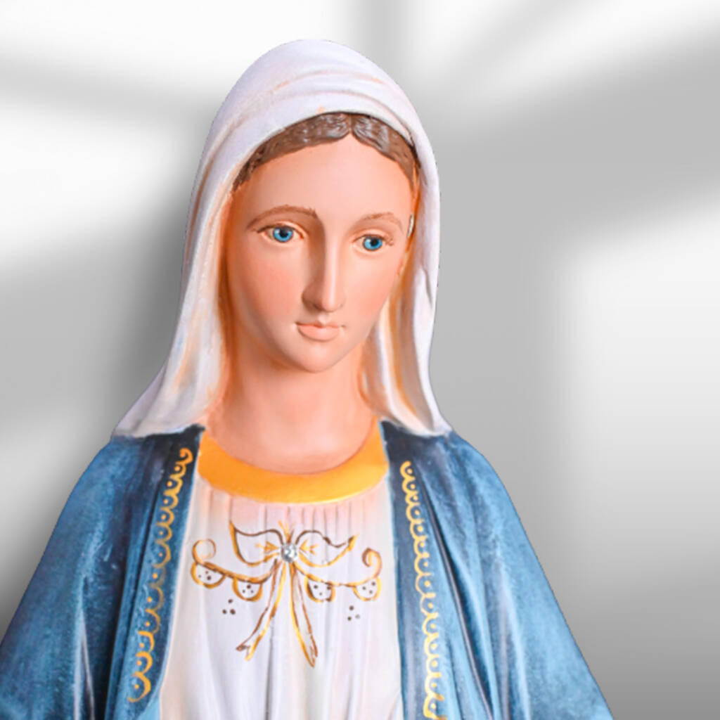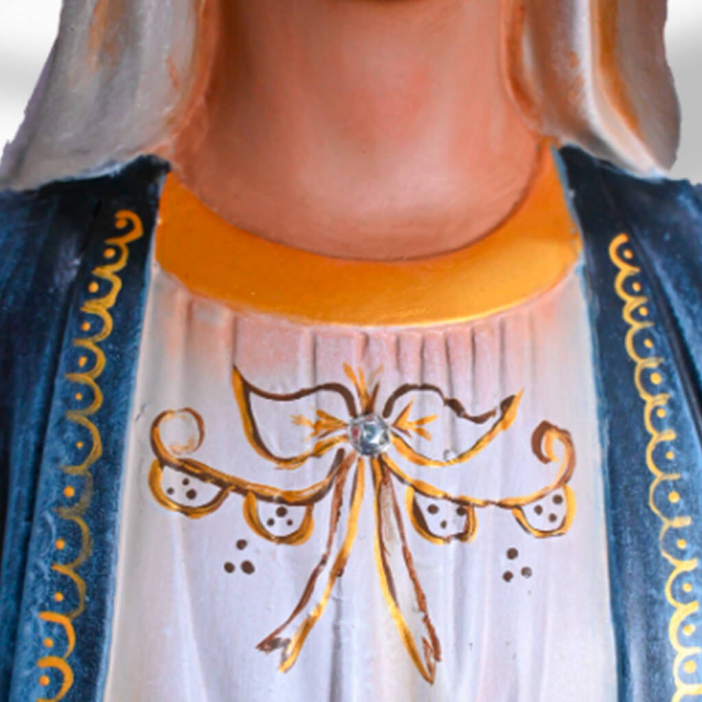 O rosto de Maria é representado com expressão suave e compassiva. Seu olhar, levemente inclinado, revela cuidado materno e a certeza de que nenhuma oração passa despercebida diante de sua ternura.
