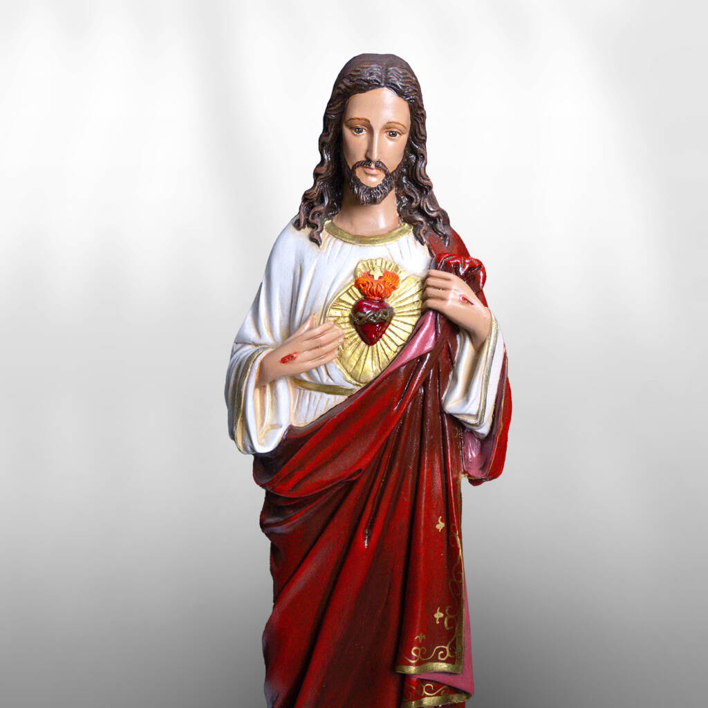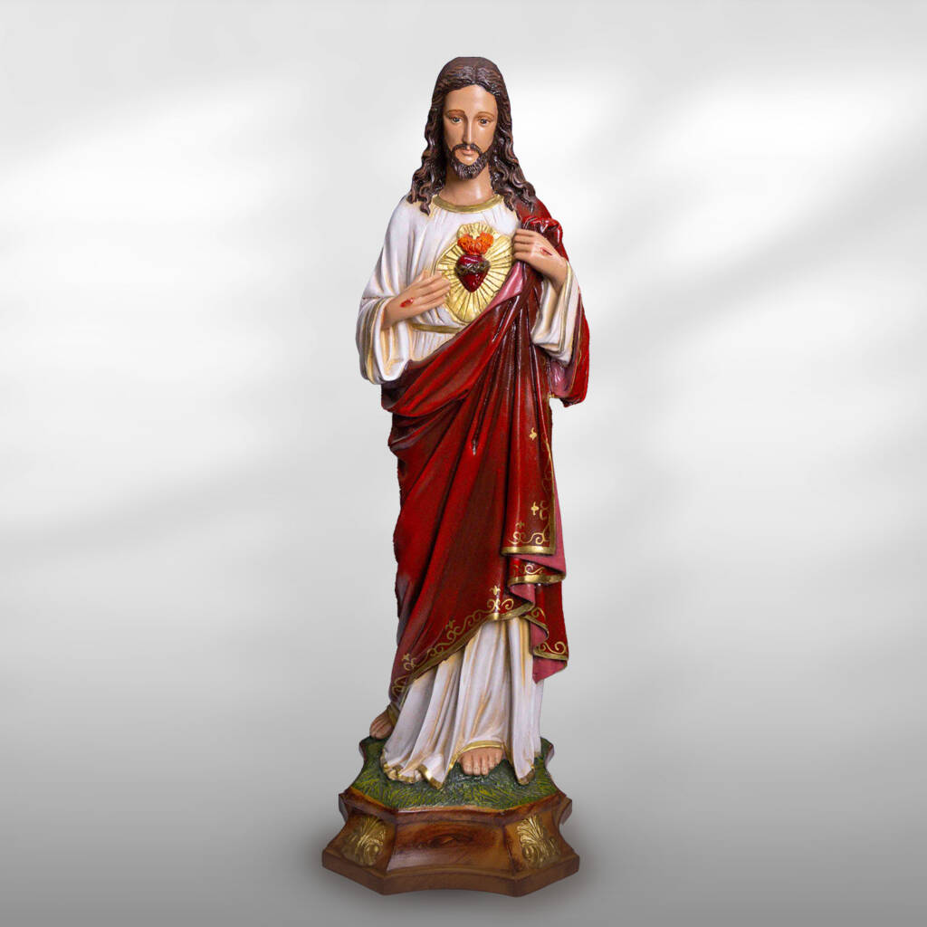 O Coração exposto, envolto em chamas, coroa e cruz, manifesta o amor que se entrega. É símbolo de misericórdia sem medida, vitória sobre a morte e desejo profundo de reunir toda a humanidade em sua luz.